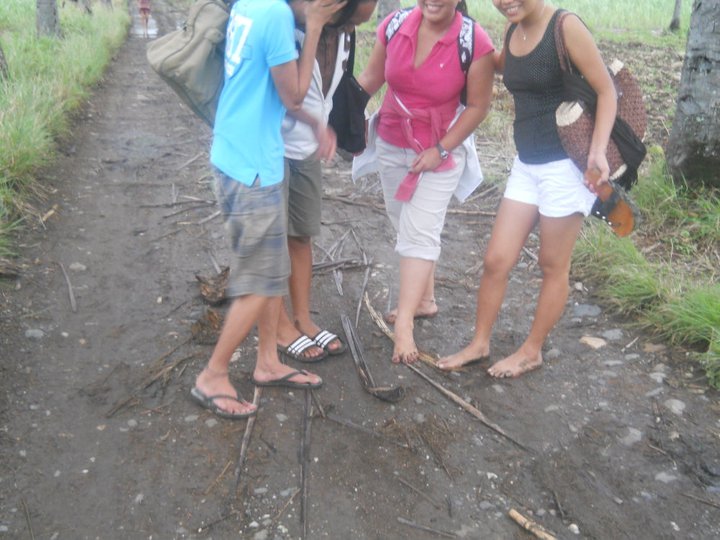 After walking past coconut laden path, muddied rice and sugarcane plantations, trekked uphill and tiptoed on the bridge, we have reached this cemented road with a structure that is good for posing...:-)